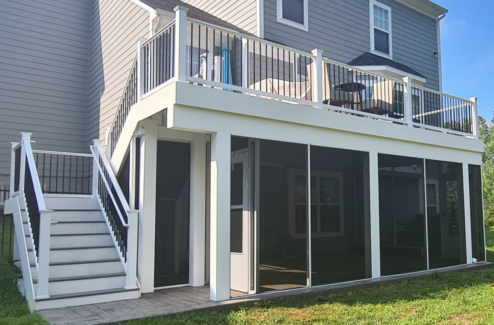 Screened in below deck with fiberglass screen, white track system with 2 aluminum doors Zip up underdeck system for dry space